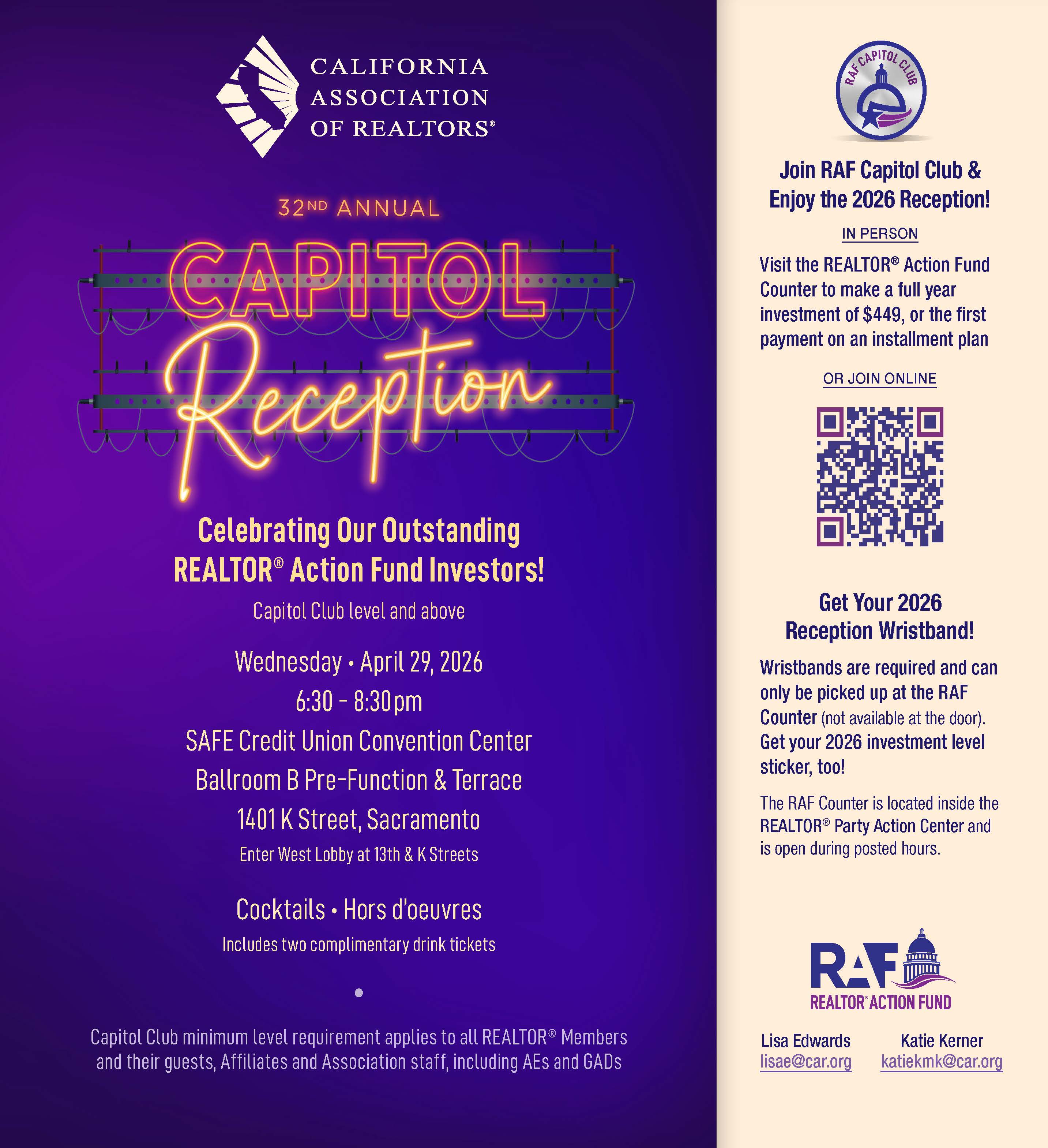 The RAA: Protecting REALTORS® and Homeownership REALTOR® Action FundC.A.R. Senior Vice President Sanjay Wagle sits down with Republican Assemblymembers Heather Hadwick and David Tangipa for a “Meet the Freshmen” conversation about their first term in the Legislature, what they’ve learned, and how they hope to move forward in 2026.
